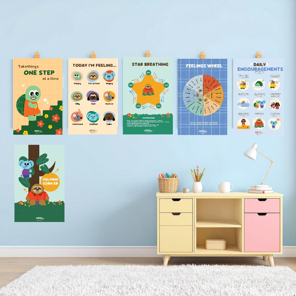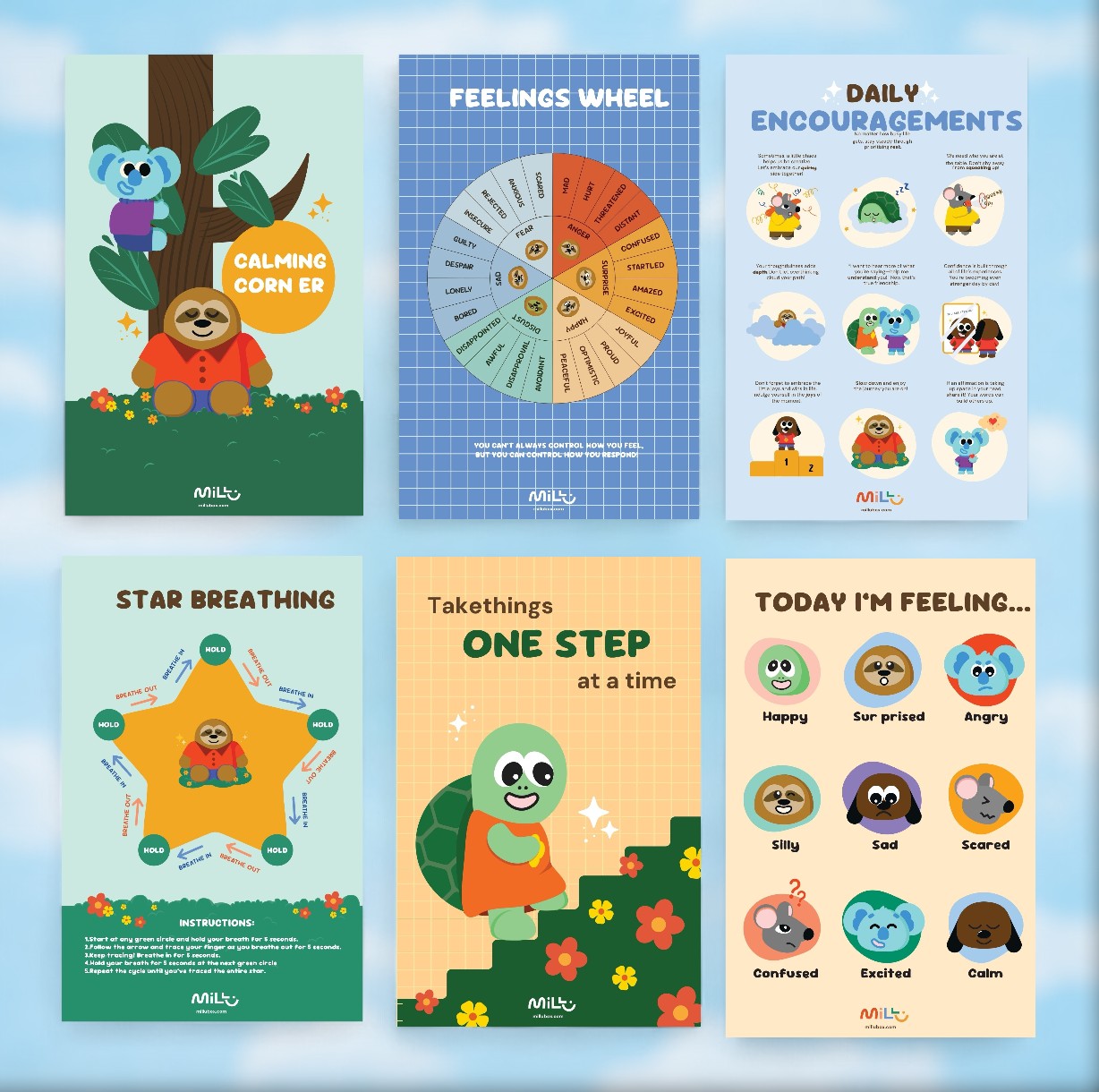The MILLU Calming Corner Poster Set turns any part of your home into a comforting space where kids can breathe, reset, and talk about emotions. With adorable characters and simple guidance, each poster helps children handle big feelings with confidence — whether they’re overwhelmed, overstimulated, or just need a quiet moment.